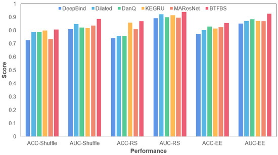 The performance of BTFBS is compared with several conventional methods for predicting protein-DNA-binding sites [18], namely, DeepBind [2], Dilated [3], KEGRU [4], DanQ [5], and MAResNet [6]. DeepBind, Dilated, DanQ, and KEGRU were implemented based on the deepRAM [9] framework. Since our model has two input parts, to ensure fairness, we modify BTFBS to take only one input of DNA sequence for comparison with these models. Bacterial binding sites are used as positive samples (while negative samples are obtained through deepRAM), and they are randomly divided into a training set comprising 80% and a test set comprising 20% of the samples. The aforementioned data are then used to train DeepBind, Dilated, DanQ, KEGRU, and MAResNet, respectively. Following the completion of three-fold cross-validation on the training set and subsequent evaluation of the models’ performance on the test dataset, the two metrics for the different models on the test datset are as presented in Figure 6, and Table 3 lists additional performance metrics for these models. The accuracy and AUC of BTFBS are 0.8065 and 0.8854, representing an improvement of 0.86% in accuracy and 3.72% in AUC compared to the second-highest-performing model.