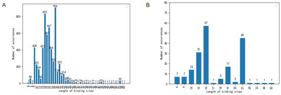 Binding site length distribution map. (A) Distribution of all binding site lengths. (B) Streptococcus binding site length distribution.
