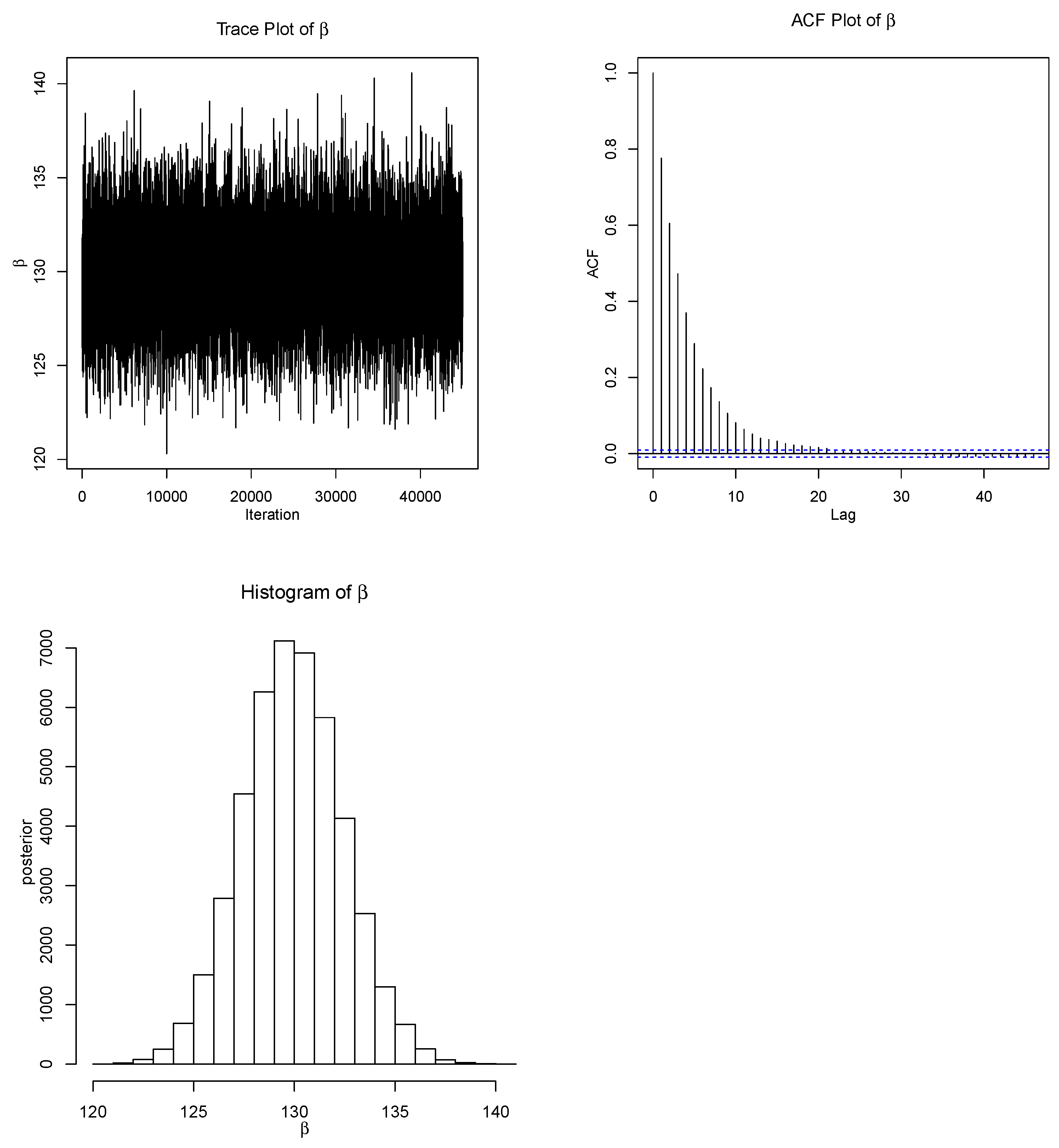 The trace and ACF plots are used effectively in checking the convergence of the M–H algorithm as a graphical diagnostic convergence tool. The trace and ACF plots for