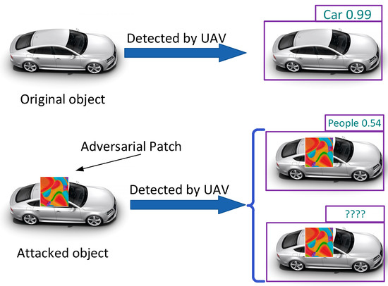 - Shrestha, S.; Pathak, S.; Viegas, E.K. Towards a Robust Adversarial Patch Attack against Unmanned Aerial Vehicles Object Detection. In Proceedings of the IEEE/RSJ International Conference on Intelligent Robots and Systems (IROS), Detroit, MI, USA, 1–5 October 2023; pp. 3256–3263. [Google Scholar]
