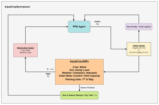 In this study, PPO was implemented using the Stable-Baselines3 library [] and integrated into the AquaCrop-OSPy simulation through the Gymnasium framework. The RL agent interacts with the simulation environment, receiving daily observations of crop and environmental parameters (e.g., soil moisture and precipitation) and selecting irrigation actions (0 mm or 25 mm) at each timestep. The clipped surrogate objective in PPO ensures stable learning in this sparse-reward setting by preventing overly aggressive policy updates, enabling the agent to refine its irrigation decisions over successive episodes.