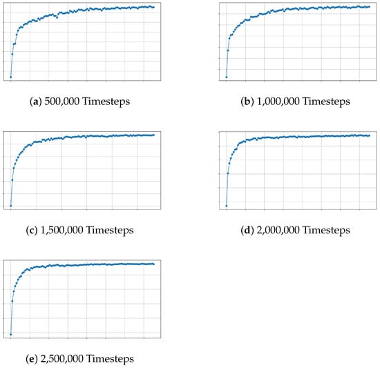 With these optimal hyperparameters, we retrained the PPO agent for various durations (500,000, 1,000,000, 1,500,000, 2,000,000, and 2,500,000 timesteps) to assess how the agent’s performance evolved over extended training periods. Evaluating policies saved at these checkpoints provided insights into the stability, consistency, and reliability of the learned irrigation strategies.
