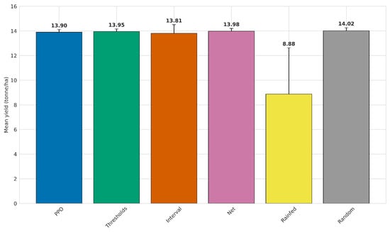 The rainfed strategy, relying solely on natural precipitation, predictably results in the lowest yield (8.88 t/ha). Despite its minimal water input, its inconsistent and insufficient moisture supply hinders productivity compared to strategies that supplement rainfall with irrigation.