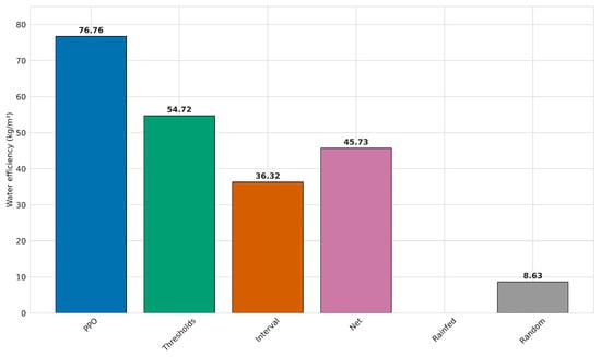 Additionally, the PPO strategy achieves the highest water efficiency (76.76 kg/ha/mm), surpassing conventional irrigation techniques (see Table 4 and Figure 5). This improved efficiency could, over time, lead to more sustainable water usage, helping reduce nutrient runoff and soil erosion. By ensuring that irrigation occurs only when necessary, the PPO model minimizes ecological disturbances, supports healthier ecosystems, and preserves natural habitats.