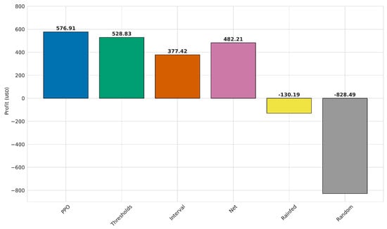 In comparing our results to prior work, we focus specifically on studies using SMT and PPO. Kelly et al. [] reported profits of USD 521.00/ha for SMT and USD 520.10/ha for PPO under similar cost assumptions. Our SMT approach achieves USD 528.83/ha, slightly exceeding their SMT profit, indicating incremental gains through refined threshold management. More notably, our PPO strategy attains USD 576.91/ha, surpassing their PPO profit by approximately 11%, demonstrating that a reward mechanism emphasizing both yield and water conservation, paired with a daily decision interval, can significantly enhance profitability (Figure 6).
