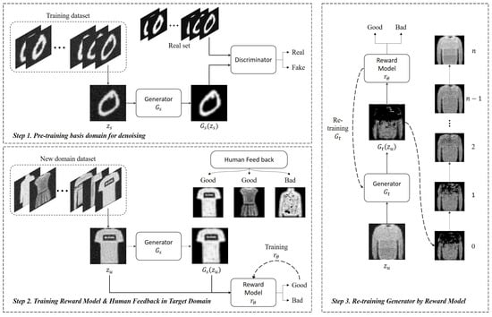 The integration of human feedback has demonstrated high adaptability across various domains [,,]. This valuable information is used to train a reward model, which acts as a substitute for human assessment and enhances the model’s performance. In this section, we provide a detailed description of how human feedback is gathered. In the previous section, we presented the basic denoising GAN model using pix2pix [], which we referred to as the supervised denoising model (SDM). Human feedback is obtained through manual assessments of the SDM results from unseen domain samples . The assessments are categorized as ‘Good’ if the image was clean and ‘Bad’ if the image contained noise or collapse (see Step 2 in Figure 2).