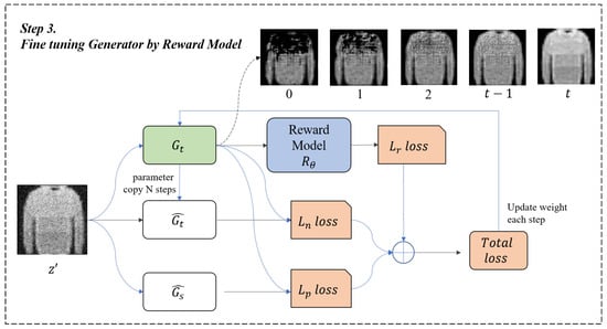 - Reward Loss : The primary objective of generator is to generate denoised images that are assessed by the reward model as ‘’ (0, indicating clean images). The minimization of aims to train generator to generate clean images. In other words, the reward loss trains to map from the distribution of ‘’ quality images (distribution j) to the distribution of ‘’ quality images (distribution k), .where is a reward model trained on human feedback that has fixed parameters. Thus, only assesses the quality of the generated image from and the input image .