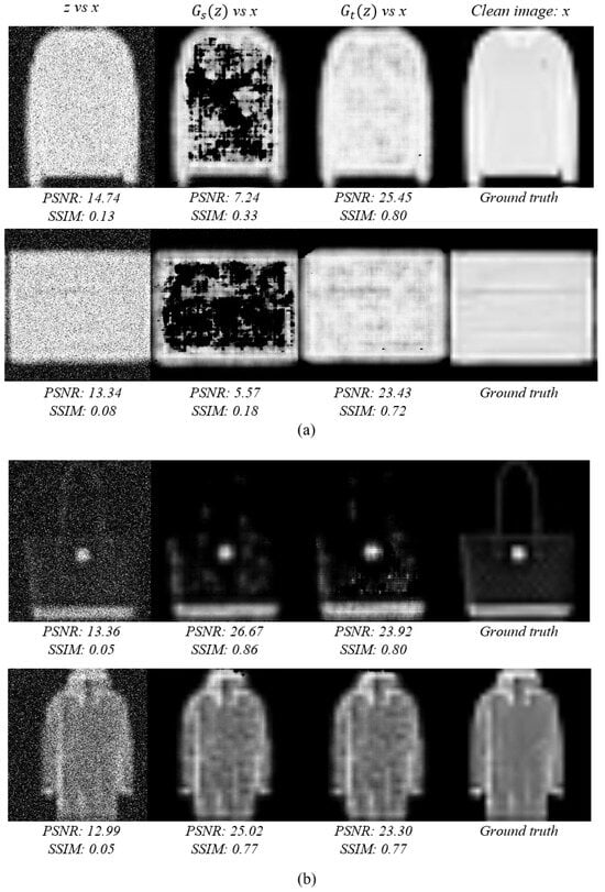 In the experiments, the MNIST data set serves as the source domain for training the initial denoising generator. Specifically, only the ‘0’ digit is used for restrictive training on the source domain. The training set consists of 6000 samples, and the validation set contains 1000 samples. The MNIST images are resized to a size of 256 × 256 pixels using bicubic interpolation. To train the initial denoising generator, a pair of data points is required, consisting of clean and noisy images. The original MNIST data set is used as the clean image counterpart, while the noisy images are created by introducing artifact noise in the form of salt-and-pepper noise combined with Gaussian noise. The salt-and-pepper noise was applied with equal proportions of salt and pepper pixels at 50%, while the Gaussian noise was added with a mean of 0 and a standard deviation of 0.05, perturbing the pixel intensity values. This approach ensures a controlled and reproducible noise level, typical for evaluating image denoising models [].