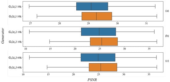 Figure 5. Boxplot of PSNR for each generator and on the experimental data set. Even after fine-tuning on unseen data, we observe that produces results without PSNR degradation in the pre-training domain. This finding demonstrates the effectiveness of our proposed method, which utilizes human feedback to mitigate catastrophic forgetting. (a) MNIST test set (10k). (b) Fashion-MNIST test set (10k). (c) Fashion-MNIST train set (60k). - Visual evaluation: Figure 4 illustrates the improvement in denoising and restoration, particularly in addressing image collapse. Notably, trained on the ‘0’ digits of MNIST, exhibits instances where the results suffer from image collapse in several images, indicating a lack of adaptation. However, our approach effectively enhances the image quality by leveraging human feedback, as demonstrated by the results obtained with .