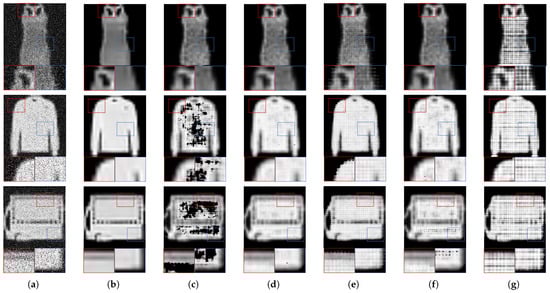 Figure 6. Comparison of image quality with and without the auxiliary loss. (d–g) Results with different auxiliary loss conditions. Each condition improves the image quality compared to (c), but there are noticeable differences in details such as texture and artifacts. (a) Input image with noise. (b) Ground truth. (c) Denoised images by . (d) Denoised images by . (e) Denoised images by without the term. (f) Denoised images by without the term. (g) Denoised images by using only the term. - Effect of term: represents the loss between the ()th and (n)th iterations of G( and ). In terms of quantitative evaluation, it demonstrates comparable performance (Table 1, first and third row). However, in qualitative assessment, it becomes evident that there are limitations in generating the desired image to a satisfactory degree. (See Figure 6d–f). We also examine the effect of loss on the output quality. The role of is to restrict significant parameter changes from the previous model. Given that the function of is to restrict parameter updates between the previous and current models, it becomes apparent that there are limitations in generating the desired image to a satisfactory extent in qualitative evaluation, leading to potential issues such as collapse.