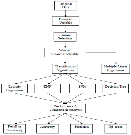 The output of this feature selection yields a refined set of financial variables. For the modeling approaches, the selected financial variables are utilized in several classification algorithms, including (1) Logistic Regression, which is designed for binary or multinomial classification; (2) KNN (K-Nearest Neighbors), a non-parametric method that classifies based on proximity to neighbors; (3) SVM (Support Vector Machine), a supervised learning model that identifies the hyperplane that best separates the classes; and (4) Decision Tree, a tree-structured algorithm used for both classification and regression by making decisions based on feature splits. Additionally, Multiple Linear Regression is employed to predict continuous outcomes using the selected variables. The outputs from these algorithms are then evaluated for performance through a comparative analysis. The performance metrics assessed include recall (sensitivity), accuracy, precision, and F1-Score.