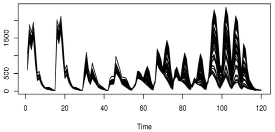 Although a similar type of analysis has been conducted previously (see []), our contribution introduces a functional single-index (FSI) approach that combines the near-infrared (NIR) spectral curves with a robust estimation procedure. The aim is to enhance predictive performance compared to traditional methods. The NIR data used in this study can be found at http://www.models.life.ku.dk/Yogurt (accessed on 20 September 2024). These spectral measurements were obtained using a BioView spectro-fluorometer, yielding absorbance profiles at 120 wave points between 270–550 nm and at wavelengths ranging from 310–590 nm. The dataset contains 115 spectral curves , as illustrated in Figure 4. Additional details regarding this dataset can be found in [].