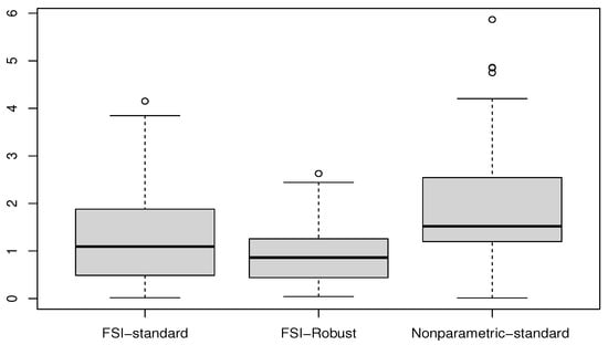 Overall, all estimators demonstrate strong performance; however, FSI-based methods exhibit a distinct advantage. This superiority is particularly evident in the interquartile range (IQR) presented in Figure 5, which highlights the greater consistency of . Specifically, the IQR for is approximately , which is notably smaller than those of and , respectively. These findings align with theoretical expectations, as the FSI framework, when integrated with a robust quantile-based approach, effectively mitigates the challenges posed by the high-dimensional nature of the functional regressor.