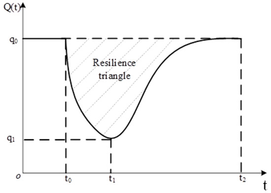 In network resilience research, transportation networks’ resilience is typically evaluated using cumulative performance loss during interference periods. As depicted in Figure 1, when the perturbance occurs at time , the URTN performance keeps decreasing to the lowest point at time . Then, the network gradually recovers because of implemented recovery measures until it reaches normal operational status at time . represents the performance indicator value of the network at time . and denote the performance indicator values of the network at times and , respectively.