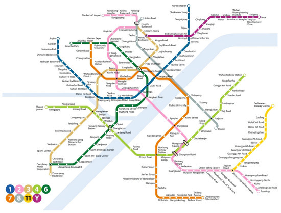 Wuhan, situated in central China, holds prominence as one of the largest cities in China, populated by over 13 million people. By April 2019, the Wuhan URTN had expanded to encompass nine operational lines and 190 stations, collectively spanning 319.87 km. Notably, the system accommodates an average daily ridership nearing 3 million passengers, constituting approximately 40% of Wuhan’s total public transportation users. This extensive subway infrastructure significantly contributes to the amelioration of urban traffic congestion within the city. The layout of the Wuhan URTN in April 2019 is shown as Figure 2.