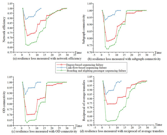 where represents the assessment result of network resilience based on the -th network performance indicator (where correspond to the network resilience using network efficiency, subgraph connectivity, OD connectivity, and reciprocal of average transfers per passenger, respectively, as network performance indicators). denotes the -th network performance indicator under normal network operation at time . is computed according to Equations (8)–(11). and denote the start time of the perturbance and the time when the network returns to normal operation, respectively.