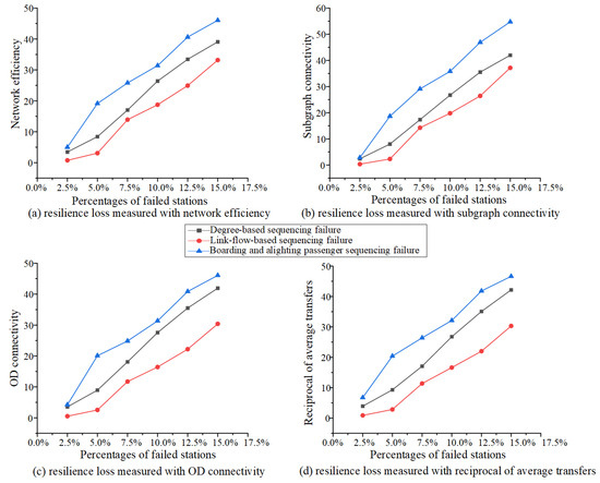 To reveal the resilience of the Wuhan URTN when different fractions of stations failed with three modes, the network resilience losses corresponding to different fractions of station failure were computed and are shown in Figure 5. Figure 5 shows that among the three failure modes, the station failure mode with boarding and alighting passenger sequencing exhibited the most significant reduction in network resilience. Conversely, the station failure mode with link-flow-based sequencing demonstrated the least impact on network resilience, whereas the station failure mode with degree-based sequencing resulted in resilience reductions intermediate to the other two modes. The reason for this was that the stations selected with link-flow-based sequencing were adjacent, which tended to result in localized cascade failures. Conversely, the failed stations selected by boarding and alighting passenger sequencing and degree-based sequencing were typically distributed across the network, potentially initiating extensive cascading failures throughout the network. The cascade diffusion in Figure 4 confirms this point.