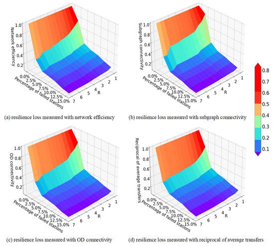 Based on the results of sensitivity analysis in the URTN, several conclusions can be drawn. When there were few failed stations, the influence of the structure-based coupling coefficient had no significant effect on network performance. This insignificance stemmed from the limited number of stations affected, where variations in alone did not significantly alter the propagation dynamics of cascading failures. As the number of failed stations increased moderately, the structure-based coupling coefficient began to have a noticeable impact on network performance. This effect may have arisen because the simulation simulated the failure mode with degree-based sequencing. With increases in the coupling coefficient , the failure of a station affects its adjacent stations to a greater extent, thus accelerating the spread of faults in the URTN. However, as the number of failed stations reached a high level, the influence of diminished again. This reduction was primarily due to widespread station failures across the network, leading to its near-total incapacitation. Consequently, variations in the structure-based coupling coefficient resulted in only marginal fluctuations in observed performance indicators.
