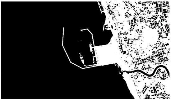 Otsu’s method is applied to automatically perform thresholds for separating the pixels of the transmitted images into two categories: 1. dark pixels for ocean and river and 2. white pixels for static obstacles, such as banks, buildings, and so on. Applying Otsu’s method to Figure 2, the binarization result of the image process is shown in Figure 3.