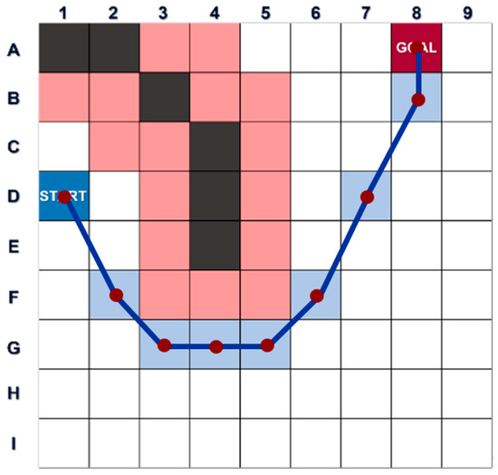 The result illustrating the combination of geofencing and the double-sided FAA* algorithm is revealed in Figure 9. In Figure 9, a layer of geofencing (pink color) is made for covering the outer edges of obstacles, and a set of collision free waypoints (blue points) are found optimally.