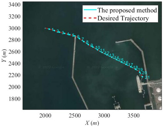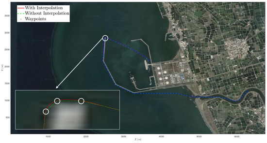 Figure 12 shows the comparisons of the search result of the multi-sided FAA* algorithm via directly connecting two neighboring waypoints (green color) and the trajectory (red color) interpolated by the proposed collision-free control system. This figure reveals that the green trajectory consists of several sharp turning points, and they are difficult for the controlled USVs to follow up on based on the limited command outputs of installed actuators. By utilizing this proposed interpolation algorithm, a smooth collision-free trajectory can be obtained, such as the trajectory in Figure 12 plotted in a red color.