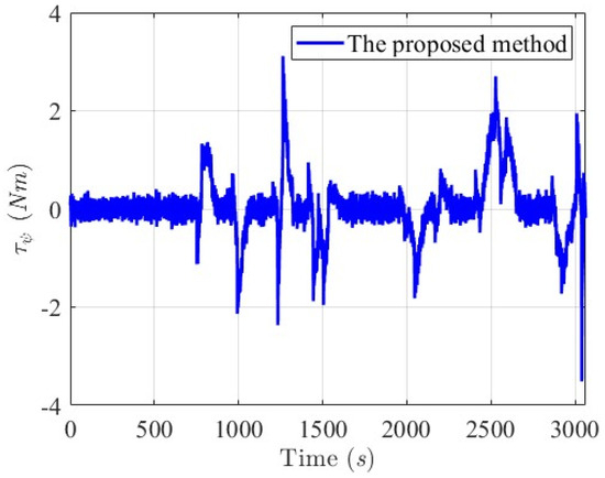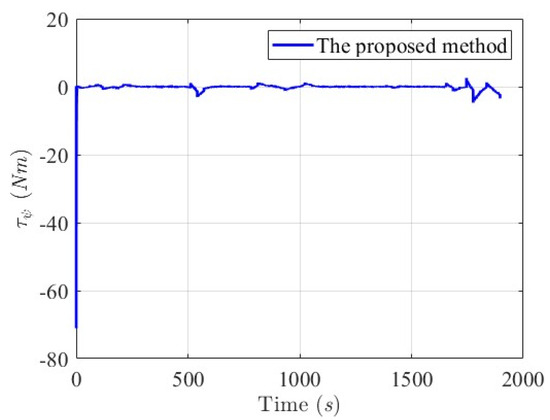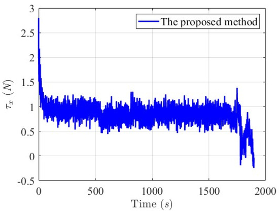 Histories of the proposed nonlinear robust control law are plotted as follows in Figure 21, Figure 22 and Figure 23. Initially, the control forces and torque are larger for quickly mitigating and guiding the USV to follow the desired trajectory (red line). Since there are two marine structures in the first and second trajectory segments, the negative forces τx(t) and τy(t) and the torques τψ(t) are delivered to rotate the heading direction of the USV and maintain the sailing paths the within t ∈ [500 s, 1000 s] and t ∈ [1650 s, 1800 s]. Due to the rapid convergent properties of tracking errors , , and , small control efforts are spent in whole-trajectory-tracking histories once the sailing path of the controlled USV attaches to the desired trajectory.