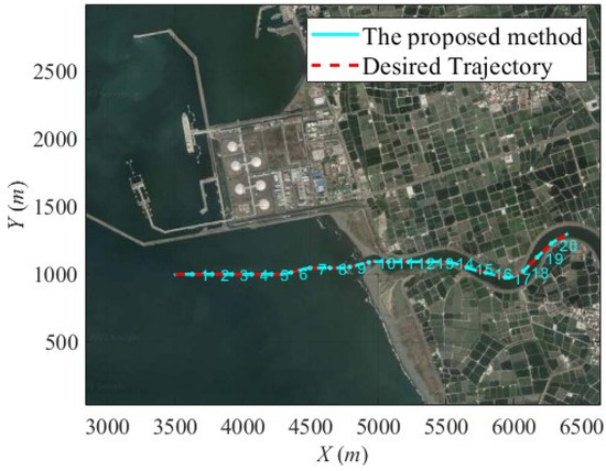 In this scenario, the Agongdian River is selected for the verification of this proposed unified control system. The required sailing trajectory of this scenario is complicated because most of the sailing trajectory of this scenario is full of obstacles (point 8~point 20 of Figure 28), such as rocks, banks, and so on. Obviously, Scenario 2 is tougher regarding terrain than Scenario 1, and this issue strongly challenges the searching ability of the proposed trajectory generator and the trajectory-tracking ability of the proposed robust control law.
