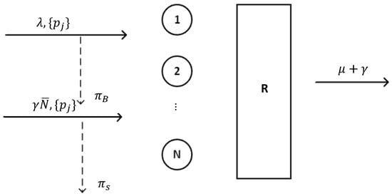 Consider the concept presented in [15]. The authors approximated the behavior of an ReLS with signals by the ReLS without signals but with an additional arrival flow, as discussed below. Assume that, upon arrival of a signal, the associated customer leaves the system, so the service intensity of customers is actually . However, with probability , the customer returns to new resource requirements. We treated these returning customers as an additional arrival flow with an intensity , where is the mean number of customers in the system. A schematic of the system is shown in Figure 2.