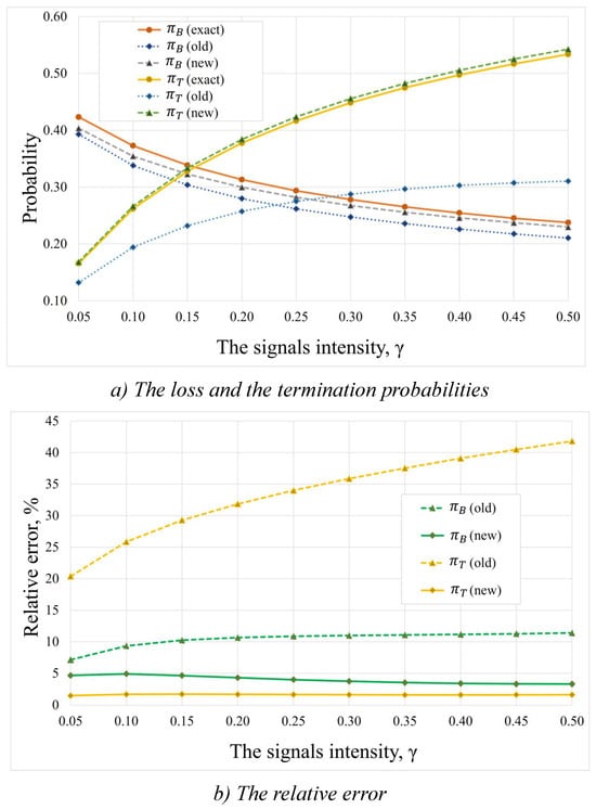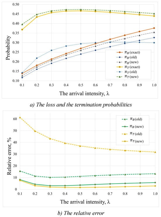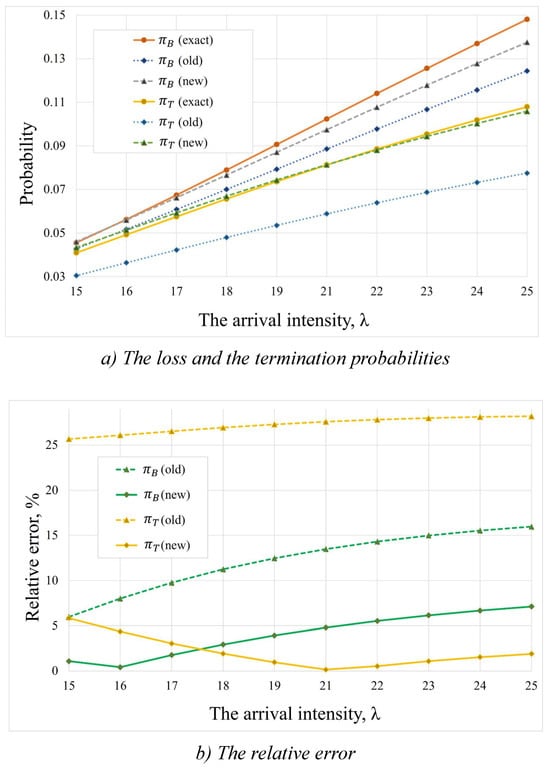 The results for different arrival intensities are shown in Figure 7, where Figure 7a presents the dependence of the loss and termination probabilities on the signal intensity, while Figure 7b illustrates the relative error of the approximation methods. The old approximation method showed an acceptable accuracy for the loss probability. However, the relative error of the termination probability was still far from acceptable. The new approximation method shows much better performance for both the loss and termination probabilities, where the relative errors always remain below 5%.