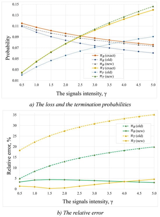 Figure 5 presents the dependence of the loss and termination probabilities on the intensity of the signal arrivals under an arrival intensity . Specifically, Figure 5a shows the absolute values of the loss and termination probabilities. It can be observed that there is an inverse relationship between the loss and termination probabilities under these conditions. This phenomenon can be explained by the fact that, as the intensity of the signal increases, so does the frequency of service terminations, resulting in an increase in the fraction of unoccupied resource units. Consequently, the probability of loss of newly arriving customers decreases. Figure 5b shows the relative errors when using these approximation methods. Both methods exhibited better values at low loads, but as the signal intensity increased, the old approximation method showed even worse accuracy than that in Figure 4b. In contrast, the new approximation method shows better values than those in Figure 4b, that is, the relative error does not exceed 5%.