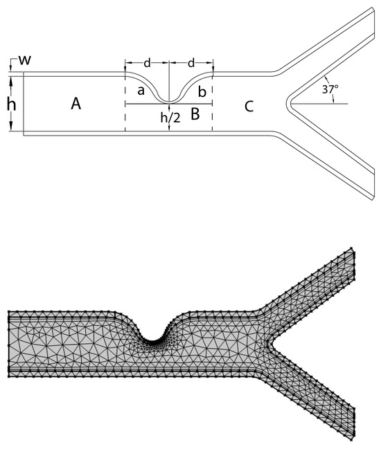 Computation domain: As shown in Figure 2, a prototype geometric model with stenosis and a bifurcation with a symmetrical arrangement is considered for the computational domain. The full length of the region is . The diameter h is considered to be 1 and shrinks to at the region of stenosis, which implies that stenosis restricts the artery about of the time. The elastic wall’s width w is estimated to be . The diameter of the daughter artery is . The bifurcation artery has an inclination of . C is the central line along which pressure is recorded. A and B are selected to predict the velocity profile’s behavior before and after stenosis. The distance between lines a and b is calculated to be . Table 1 shows the absolute error of wall shear stresses (WSS) as a function of the mesh refinement level and the number of elements. Additionally, it presents the WSS on the upper elastic wall. For Level 0 computations, we used a total of 884 finite elements.