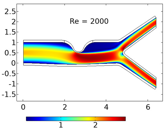 Figure 6 shows the lower wall deformation for a Reynolds number of , which is relatively small due to the high velocity and low normal pressure. As the Reynolds number increased from to 2000, the effects of backflow, stagnation, vortices, and low lateral velocities were further amplified, as expected. Figure 6 and Figure 7 illustrate these effects.