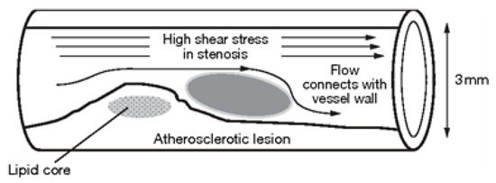 Atherosclerosis is a disease that is influenced by various risk factors, including hypercholesterolemia, modified lipoproteins, high blood pressure, diabetes, infections, and smoking. Researchers have been studying atherosclerosis for over 100 years, with a focus on the role of cholesterol in its development, as first reported by Anitschkow and Chalatov. Atherosclerotic plaques can be classified as either ‘vulnerable’ or ‘stable’, with vulnerable plaques having a significant lipid core and a thin bottom cap that separates tissue factor thrombogenic macrophages from the blood. Owasit et al. [1] found that the stenosis geometry of certain cardiovascular patients cannot be described by a vertically symmetric function across the stenosis. In their study, Zuhaila et al. [2] analyzed the dynamic response of blood flow heat transmission in stenotic conditions through a bifurcated artery with a stiff wall (2D) and Newtonian, incompressible, laminar, and constant blood flow.