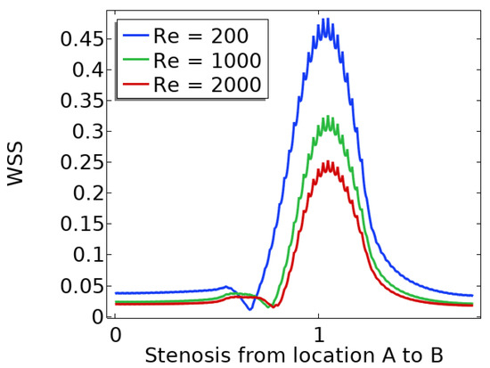 Observing wall shear stress (WSS) is essential to reduce the recirculation area in stenosed arteries, which in turn can lower the risk of atherosclerosis. Figure 10 illustrates the behavior of WSS in the stenosis for different Reynolds numbers (). The figure shows that as decreased, the magnitude of WSS increased. This indicates that a decrease in can reduce the chance of atherosclerosis in the stenosed region by increasing the total WSS experienced by the stenosis. Furthermore, it has been observed that WSS can play a crucial role in the formation and development of atherosclerotic plaques. A low or disturbed WSS can cause the endothelium to become dysfunctional and lead to the initiation of atherosclerosis. On the other hand, a high and unidirectional WSS can maintain the endothelium in a healthy state and protect against atherosclerosis. Therefore, the measurement and analysis of the WSS can provide valuable insights into the progression and treatment of cardiovascular diseases.