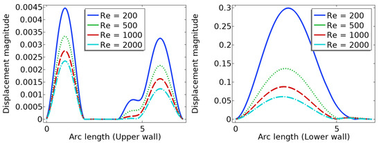 The deformation of the arterial wall is an important factor to consider, as it can affect the overall health of the artery. In Figure 11, the behavior of wall displacement is shown. It can be observed that there is a comparatively small deformation at the stenosis position. This is due to the difference in elastic modulus between the stenotic and nonstenotic walls. As the value of Reynolds number increased, the displacement or deformation of the wall decreased.