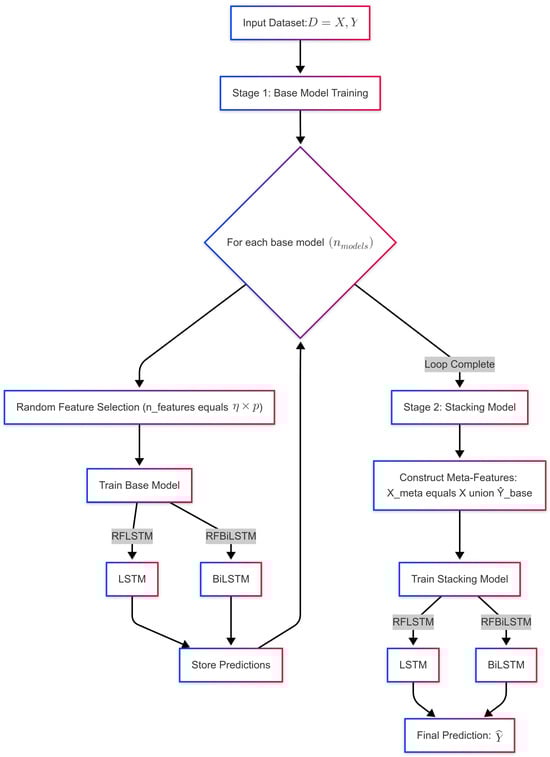 The algorithms presented here are similar to the random forest (RF) procedure regarding model and variable uncertainty. In the first stage, a similitude of RF bootstrapping of several samples is implemented by creating several from random feature combinations. This simultaneously incorporates variable uncertainty. In the second stage, instead of aggregating the predicted outcomes as in RF, we implemented a stacking approach similar to boosting the base algorithm LSTM/BiLSTM using the predictions in the training stage. It is important to note that the number of models and number of features must be less than n and p, respectively, to avoid singularity issues during the training in stage 1 and prediction in stage 2.