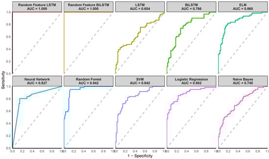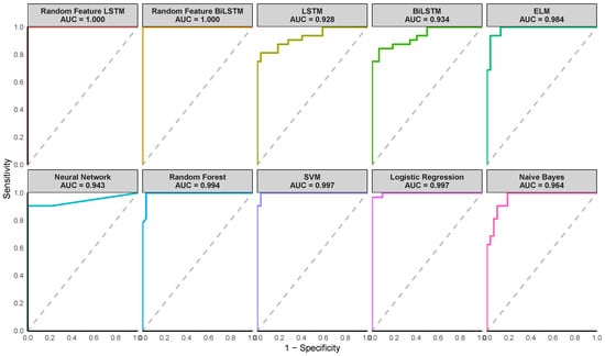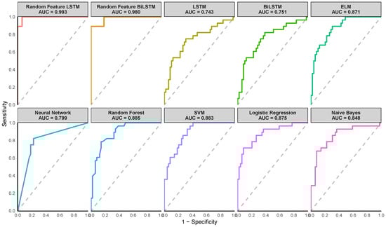The computational time results in Table 7 show significant differences in computational efficiency across methods. The proposed Random Feature BiLSTM (2.94 s) is much faster than the LSTM (5.68 s), proposed Random Feature LSTM (12.87 s), and BiLSTM (11.25 s), demonstrating the benefits of random feature augmentation for BiLSTM in terms of computational speed. However, ELM (0.02 s) and Naive Bayes (0.01 s) are the quickest, suitable for time-sensitive tasks. Traditional ML models like random forest (0.12 s), SVM (0.27 s), and logistic regression (0.58 s) offer a balance between speed and complexity, outperforming deep learning models in efficiency. Neural networks (0.26 s) are faster than LSTM-based models but slower than simpler algorithms. Overall, in terms of high predictive ability captured by accuracy, sensitivity, specificity, AUC, and Brier score as well as moderate computational speed, the proposed Random Feature BiLSTM is the best.