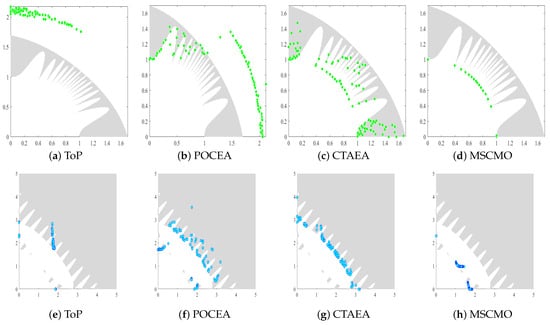 In reviewing previous CMOEAs, we found that maintaining population diversity during population iteration makes it difficult for many algorithms to effectively handle CMOP benchmark problems. The main reason for this is that the population cannot traverse large and narrow infeasible regions, preventing it from obtaining the complete feasible region. To overcome these issues, researchers have enhanced the interaction capabilities between populations to gather more information about infeasible solutions. This significantly improves the search performance of the algorithm and prevents it from becoming trapped in local optima. To further validate our proposed theory, we selected two complex CMOPs (MW5 and LIRCMOP9) with large infeasible regions to illustrate the current shortcomings of CMOEAs. Through Figure 1, we can observe the constraint Pareto front (CPF) of four representative CMOEAs (i.e., ToP [27], POCEA [28], CTAEA [9], and MSCMO [29]) on MW5 and LIRCMOP9. The blue dots and green dots represent the distribution of solutions obtained by the algorithm on the MW5 test problem and the LIRCMOP9 test problem, respectively. As shown in Figure 1a,d, both algorithms failed to find the true CPF. The main reason is the poor overall search performance of the algorithms, which prevents them from exploring the entire objective space. In contrast, as shown in Figure 1b,c,e,f,h, although all four algorithms found the CPF, they were unable to fully capture the CPF because the algorithms could not cross the narrow infeasible regions. For Figure 1d, all solutions of CTAEA lie on the CPF, but they are not evenly distributed across the CPF, mainly due to the inability to traverse the narrow and large infeasible regions.