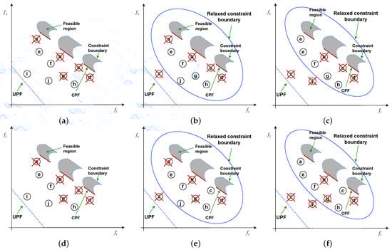 Building on this, we improved the original solution selection process. As shown in Figure 3e,f, during the constraint boundary relaxation process, a new fitness ranking mechanism (Equation (7)) is applied to all solutions within the boundary, based on diversity ranking (Equation (6)) and convergence ranking (Equation (4)). The top N solutions are then selected. This approach not only obtains more information from infeasible solutions but also prevents the loss of promising solutions close to the CPF. In Figure 3e, after applying the fitness ranking mechanism to all infeasible solutions, the lower-ranked solutions are eliminated. As shown in Figure 3e, with the relaxation of the boundary, the fitness ranking within the boundary changes. The solutions are ranked again according to Equation (7), and the lower-ranked solutions are eliminated. For example, when solution j is added, solutions a and b are moved to lower ranks and eliminated, while solutions e, f, and c move up in rank and are retained. As shown in Figure 3f, after the constraint boundary relaxation is completed, all solutions within the boundary are ranked again. Although solution a is close to the CPF, it is retained due to its high rank.