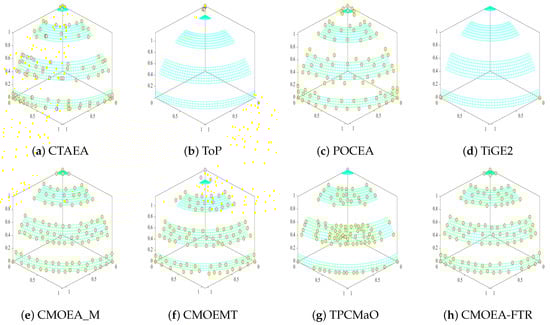 The IGD and HV data collected from 44 test problems were subjected to Wilcoxon tests. As shown in Table 3, the Wilcoxon test results compare CMOEA-FTR with seven other algorithms. It is evident that CMOEA-FTR has higher-ranked () data, with only a small portion of data () falling behind. In Table 3, TPCMaO has an IGD value of 228.0 and an HV value of 376.0, which are the highest values among all compared algorithms. However, these values are still far inferior to the values of CMOEA-FTR. Additionally, we also presented the PF distribution plots on the MW test suite. In Figure 4, the yellow dots represent the distribution of solutions obtained by the algorithm on the MW8 test problem. ToP and TiGE2 did not find PF, while POCEA and CMOEMT found PF, but only a portion of the solutions are on the PF. Although most solutions of CTAEA and CMOEA_MS are on the PF, their distributions are uneven and relatively sparse. In contrast, CMOEA-FTR not only has all solutions on the PF but also distributes them evenly and densely. Considering the Wilcoxon test results in Table 3 and the PF distribution plots on the MW test suite, CMOEA-FTR demonstrates strong competitiveness compared to other algorithms.