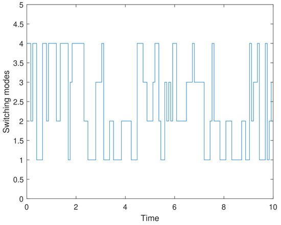 Figure 1 and Figure 2 show ten paths of stochastic disturbances and switching modes, respectively. It is easy to see that all the ten stochastic disturbances are independent and completely random, making the results more convincing and closer to real-world scenarios. Figure 3, Figure 4 and Figure 5 demonstrate the state trajectories , , and of the closed-loop systems along ten stochastic disturbances, while their average trajectories under ten samples are also shown, respectively. It indicates that each system state gradually smooths and tends to stabilize within a finite time. Then, Figure 6 shows control signals , and it demonstrates that the designed controller is effective for the system. Finally, the optimal output feedback controller has been calculated by Theorem 2. Obviously, the figure shows that each of the 10 stochastic singular systems can reach stability and hold within under the influence of 10 independently generated stochastic disturbances, and the experimental simulation shows that the method has good results.