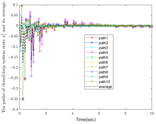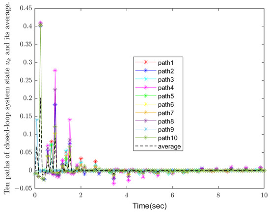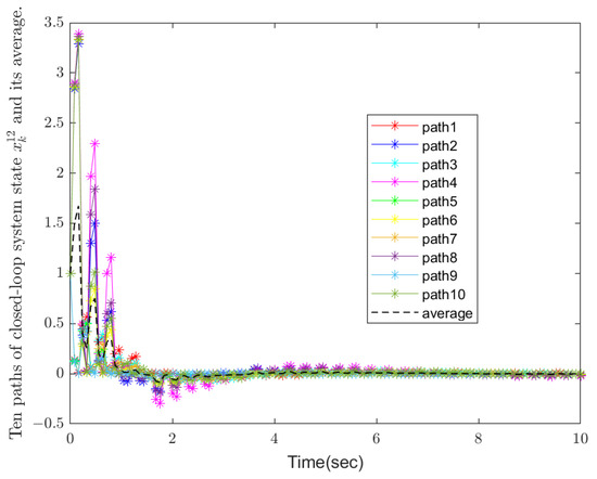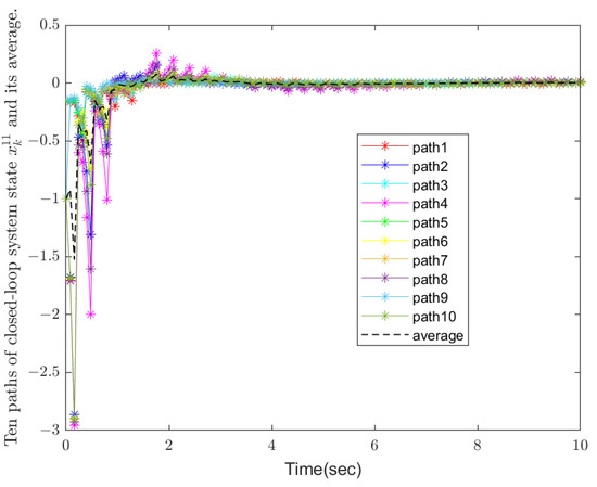 In this simulation example, an indefinite weight matrix is allowed to be introduced into the quadratic cost function, i.e., the weight matrix can have negative eigenvalues. This is significantly innovative compared with the traditional linear quadratic optimal control problem. Traditional methods usually require the weight matrix to be positive definite or positive semi-definite. However, through a series of equivalent transformations and theoretical derivations, we successfully solve the challenge brought by the indefinite weight matrix, which provides a broader space for flexible optimization of system performance. Then the LQOC problem in total could be indefinite. Thus the conditions of Theorem 2 are satisfied. We consider both random disturbance and discrete-time Markov chain in the modeling. The simulation results under the influence of 10 independent sets of disturbances and their average values are also presented. This comprehensive consideration enables the system to better simulate the uncertainty and dynamic changes in the real world and improves the robustness and adaptability of the system. In the existing research, few works can deal with these two complex factors at the same time, so it is significantly innovative in this respect. The initial condition is given by . The simulation results are given in Figure 1, Figure 2, Figure 3, Figure 4, Figure 5 and Figure 6.