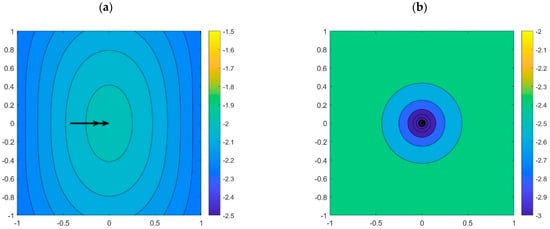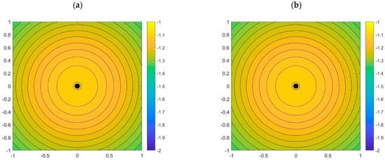 Natural logarithm of the displacement magnitude in the − plane under couple stress theory due to a point couple in the (a) direction and (b) direction at .