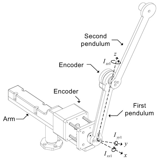 The rotary double inverted pendulum proposed in this paper is shown in Figure 1. The system uses an 80 W BLDC motor to provide power to the arm, with position and angular velocity information measured by an E40H8-5000-3-N-5 encoder (Autonics, Mundelein, IL, USA) with 20,000 CPR (Counts Per Revolution) resolution. The first pendulum is equipped with an AMT102-V encoder (Same Sky, Lake Oswego, OR, USA) with an 8192 CPR resolution, while the second pendulum uses an AS5145B encoder (ams OSRAM, Premstaetten, Austria) with a 4096 CPR resolution, both selected to meet the design requirements and provide precise positional information. To ensure structural integrity and accurate dynamic modeling, the rotary double inverted pendulum was designed and fabricated using SolidWorks (Solidworks 2024), a 3D CAD modeling tool. During the design phase, the system was meticulously modeled to maintain geometric symmetry, thereby minimizing structural imbalances. This symmetry was preserved throughout the manufacturing process to ensure the physical system adhered to the design specifications. Furthermore, each component’s material properties and mass distribution were rigorously analyzed to precisely determine the center of mass (CoM) positions, reducing discrepancies between the theoretical model and the actual system. These considerations significantly improved consistency between the mathematical model and the experimental implementation, ultimately enhancing the accuracy of system identification and control performance. For real-time control and data acquisition, we developed a rapid control prototyping (RCP) system in our research laboratory [27]. This system is the primary interface for executing control algorithms on the physical hardware while simultaneously acquiring real-time sensor feedback. To ensure precise synchronization among sensing, computation, and actuation, the sampling rate was set to 1 kHz, and MATLAB (Matlab 2022b)/Simulink (Simulink 10.6)-based real-time processing tools were employed to maintain deterministic execution of the control loop. This architecture effectively minimizes timing discrepancies and ensures stable real-time performance throughout the experimental procedure. Figure 2 illustrates the mechanical concept of the rotary double inverted pendulum.