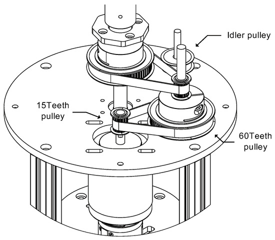 A BLDC motor is used as the drive component, and a double-reduction structure employing a timing belt and timing pulley is implemented to minimize backlash. By applying a 4:1 reduction ratio twice, a total reduction ratio of 16:1 is achieved, which improves the encoder resolution and enables precise angular velocity control. This structure is pivotal in enhancing the control performance of the rotary double inverted pendulum. First, the reduction mechanism minimizes backlash, reducing nonlinear effects. The high resolution of the encoder facilitates accurate dynamic modeling based on moments of inertia, reducing the discrepancy between control inputs and actual system responses and significantly improving model-based control consistency. Moreover, the dual-reduction structure ensures a stable high-torque output, effectively controlling the instability that can arise in nonlinear, multi-stage systems such as the rotary double inverted pendulum.