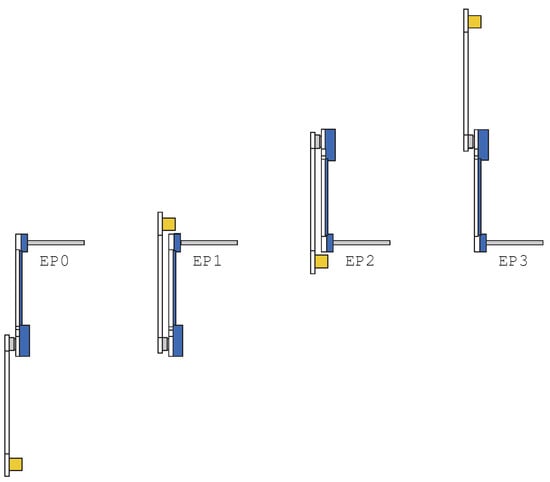 The four equilibrium points of the rotary double inverted pendulum, determined by the states of the first and second pendulum segments, are illustrated in Figure 6. In this paper, the equilibrium points are defined by assigning the states “Up” and “Down” to 1 and 0, respectively, and representing them as binary numbers. Starting with the first pendulum segment, the equilibrium point where both the first and second segments are facing downward (Down–Down) corresponds to the binary number 00 and is labeled as EP0, while the equilibrium point corresponding to the Up–Down state is represented as 10 and labeled as EP2. This naming convention offers the advantage of assigning equilibrium points systematically according to the same binary rule, even when the number of pendulum segments increases. It also facilitates intuitive understanding of the pendulum’s equilibrium states. Henceforth, in this paper, the equilibrium points of the pendulum are denoted as EP0 (Down–Down), EP1 (Down–Up), EP2 (Up–Down), and EP3 (Up–Up).