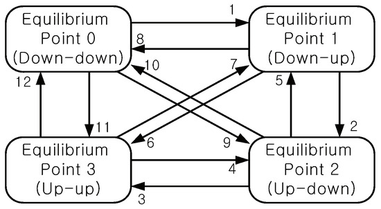 To satisfy various constraints in the 12 distinct transition control processes, additional constraints can also be applied to the pendulum’s rotational angles and , as well as their angular velocities and . Furthermore, at the start time () and end time () of the transition control, the boundary conditions corresponding to the equilibrium points for a specific transition must be satisfied. For instance, the starting and ending points differ depending on the transition number, and this situation is shown in Table 3.