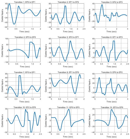 The transition trajectories obtained using the direct collocation method are shown in Figure 8 and Figure 9. Figure 8 illustrates the representative swing-up trajectory transitioning from EP0 to EP3, corresponding to transition 11. Figure 9 represents the control input trajectories used in all transitions. In the control input trajectories for transitions 4–7, the trajectories satisfy the prescribed constraints and boundary conditions during the transition process.