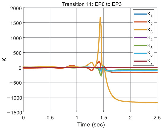 Finally, the time-varying gain can be computed using Equation (13). For example, the LQ control gain applied in Figure 8 can be observed in Figure 10.