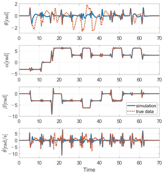 Because and are functions of four parameters (, , , and ), the combinations of , , , and that produce the same and are not unique. However, if two of these parameters are fixed, a unique solution can be obtained to estimate the remaining parameters. Therefore, among the four parameters, and (which can be directly measured) are determined using a scale and a length-measuring device, respectively. The remaining parameters, and , are estimated using experimental data. The parameters of the second pendulum are estimated using the same approach as the first pendulum. The inertia tensor can be estimated by using the method described in [7] or 3D modeling software to calculate the values. The parameters of the rotary double inverted pendulum obtained through this estimation and measurement are summarized as follows: